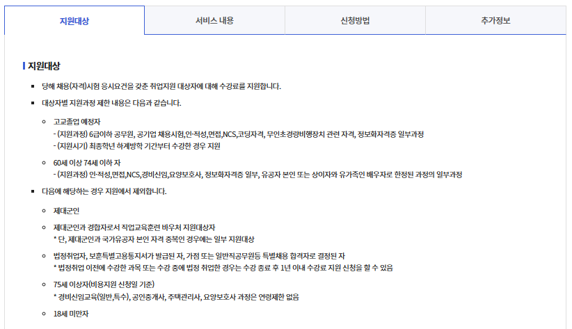 | 정보화 자격증 | 유가족 연 75만원 | 연간 한도 | 워드프로세서, 컴퓨터활용능력 등 |