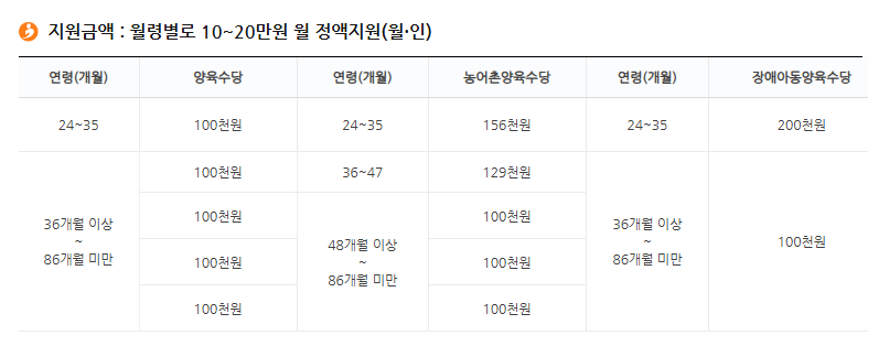 | 장애아동 양육수당 | 24~36개월 미만 월 20만원, 36~86개월 미만 월 10만원 | 24개월~86개월 미만 | 장애인 등록 아동 |