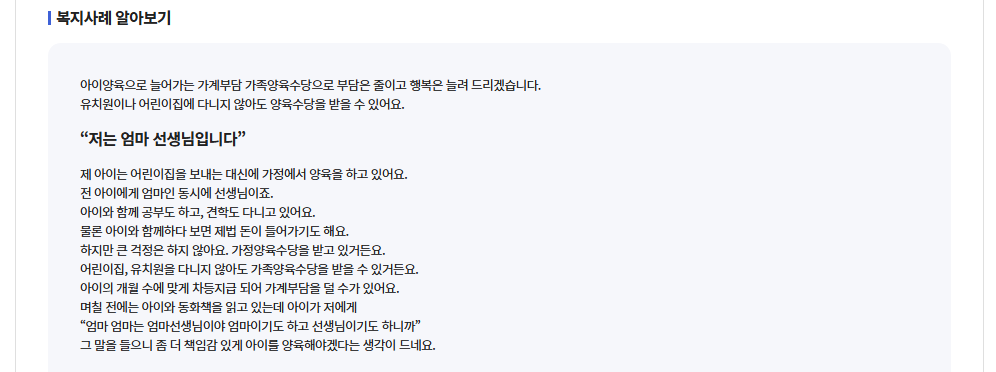 | Q3. 맞벌이 부부도 받을 수 있나요? | A3. 네, 가능합니다. 소득 제한이 없어 맞벌이 여부와 관계없이 가정에서 아이를 돌보면 누구나 받을 수 있습니다. |