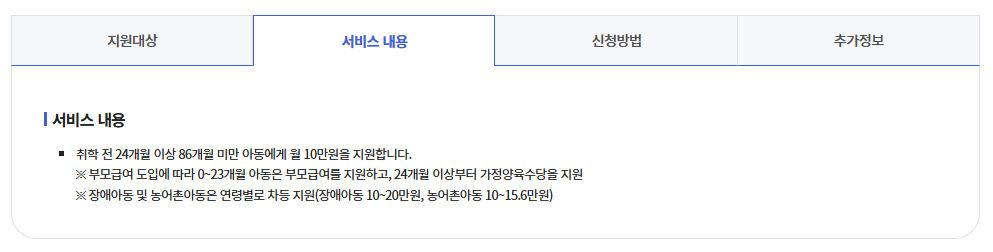 | 얼마나 받나요? | 월 10만원 (장애아동 월 20만원) | 매월 25일 지급 |