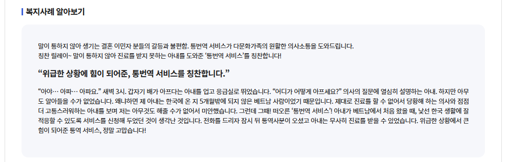 | 30대/베트남/서울 | "병원 진료 받을 때 3자 통화로 통역해줘서 의사 선생님 말씀을 정확히 이해할 수 있었어요. 정말 큰 도움이 됐습니다." | 긴급할 때는 주저하지 말고 바로 전화하세요 |