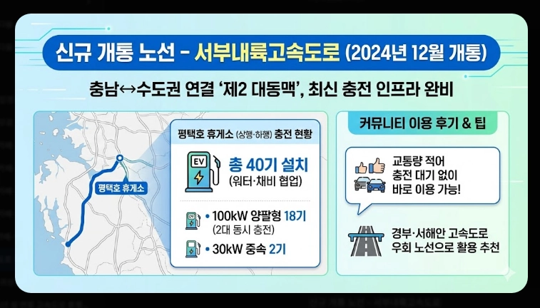2024년 12월 개통한 서부내륙고속도로는 충남과 수도권을 연결하는 '제2 대동맥'으로, 개통과 동시에 최신 충전 인프라가 완비되었습니다.