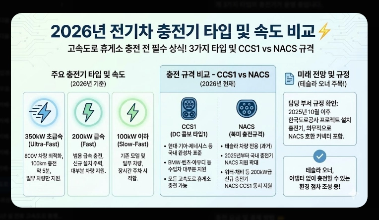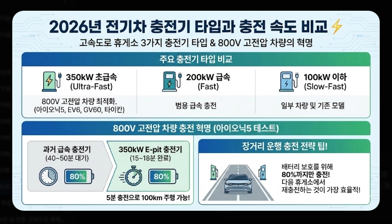 전기차 충전소를 이용하기 전에 반드시 알아야 할 것이 충전기 타입과 충전 속도입니다. 2026년 현재 고속도로 휴게소에는 크게 3가지 타입의 충전기가 운영 중입니다.