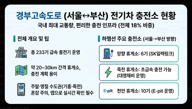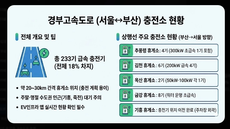 직접 확인해본 결과, 경부고속도로는 약 20~30km마다 휴게소가 위치해 있어 충전 계획 수립이 매우 용이합니다. 다만 주말과 명절에는 수도권 인근 휴게소(기흥·죽전)에 대기가 발생할 수 있으니, EV인프라 앱으로 실시간 충전 현황을 확인하는 것이 좋습니다.