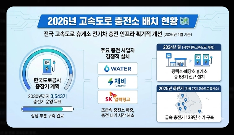 2026년 1월 현재, 전국 고속도로 휴게소의 전기차 충전 인프라는 획기적으로 개선되었습니다. 한국도로공사는 2030년까지 3,543기의 충전기를 운영한다는 중장기 계획을 발표했고, 이미 상당 부분 구축이 완료된 상태입니다.