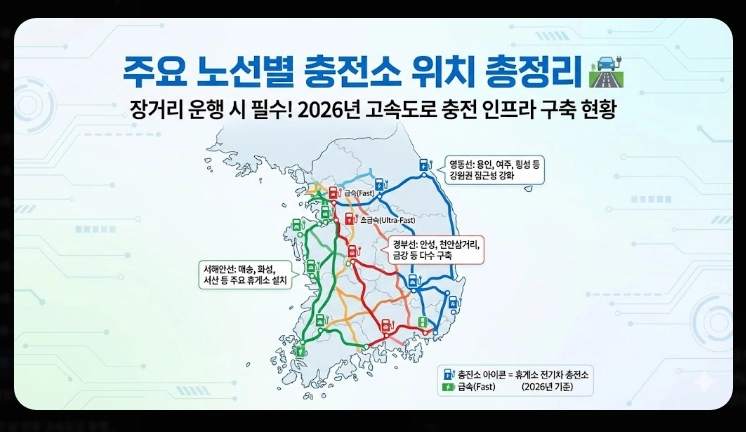 장거리 운행 시 가장 중요한 것은 충전소의 위치를 미리 파악하는 것입니다. 2026년 현재 주요 고속도로 노선별 충전 인프라는 다음과 같이 구축되어 있습니다.