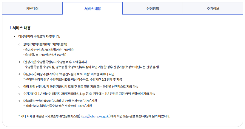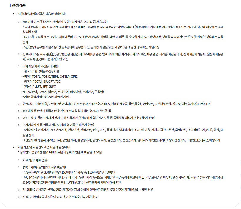 | 외국어 과정 | 토익, 토플, TEPS 등 | 연간 한도 | 취업지원대상자 등록 |