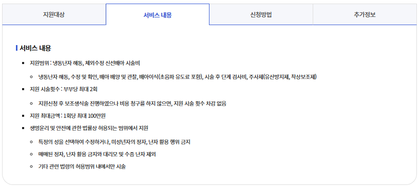 냉동난자 해동 1회당 최대 100만원 한도 내 부부당 최대 2회 냉동난자 사용 모든 부부