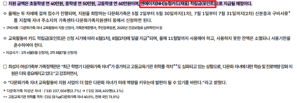 | 초등학생 | 연 40만원 | NH농협카드 포인트 | 2025년 11월말까지 |
