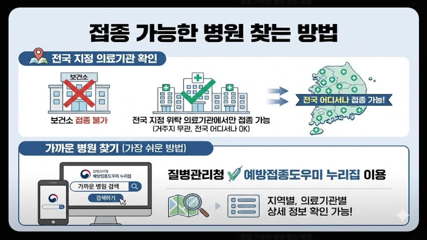 무료 접종은 꼭 거주지 병원에서만 가능한가요? 아니요. 전국 어디 지정 의료기관에서든 무료 접종이 가능합니다. 주소지와 관계없이 가까운 병원에서 받으세요.