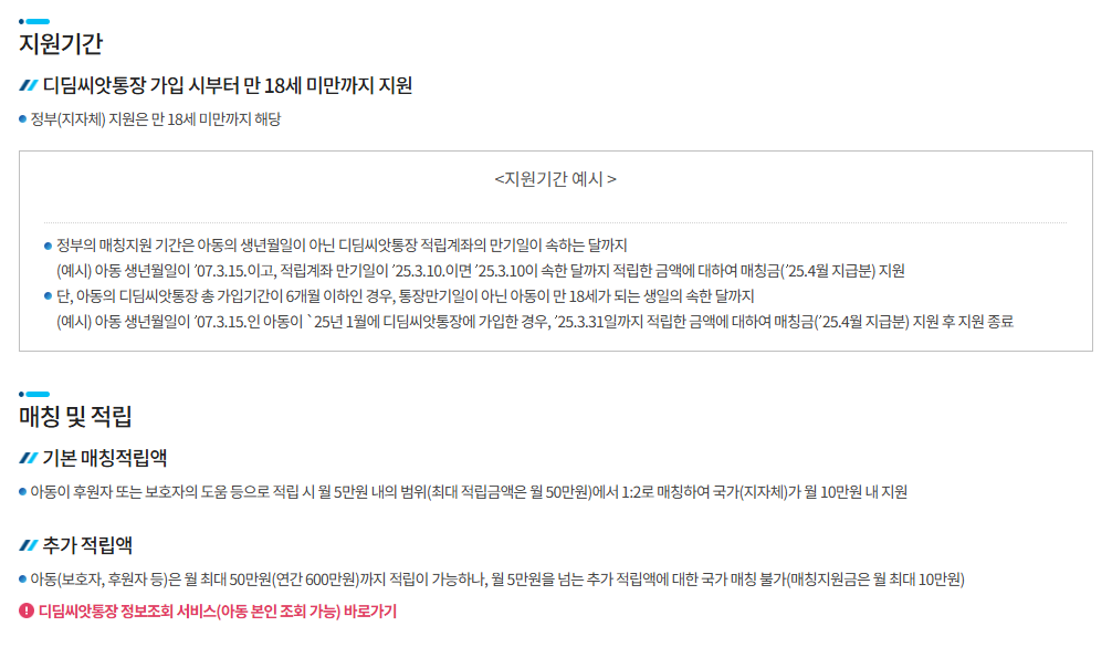 | 언제까지 받나요 | 만 18세 미만까지 정부 매칭 지원 | 적립계좌 만기일 기준 |