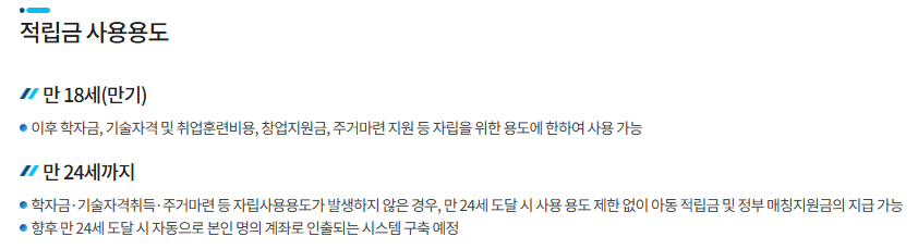 | Q4. 만 24세 이전에 학자금 외 용도로 쓸 수 있나요 | A4. 만 18세~24세 사이에는 학자금, 취업훈련비, 주거마련, 창업지원금 등 자립 용도로만 사용 가능합니다. 만 24세 이후에는 용도 제한이 없습니다. |
