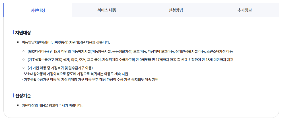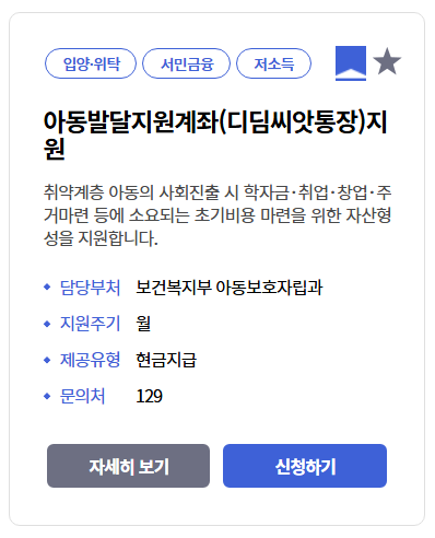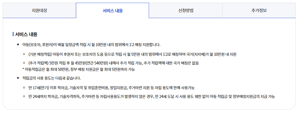 | 정부 매칭지원 | 아동 저축액의 2배, 월 최대 10만원 | 만 18세 미만까지 | 대상 아동의 월 저축 |
