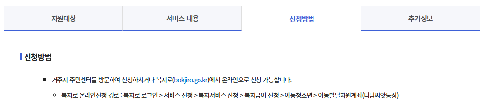 신청 방법: 거주지 시군구청 아동복지 담당 부서에 문의