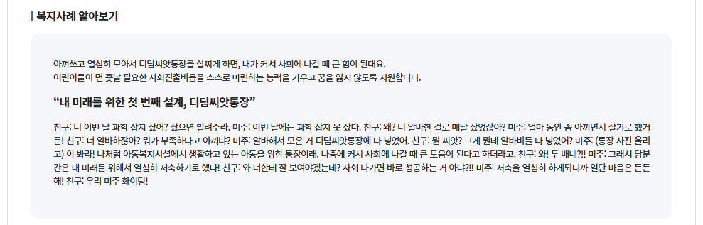 | 50대/대구 | "손주가 가정위탁으로 저희와 살고 있는데 디딤씨앗통장 덕분에 대학 갈 때까지 목돈을 만들 수 있을 것 같아요. 매월 5만원씩만 넣으면 10만원이 쌓이니까 부담도 적고 효과는 큽니다." | 월 5만원이 가장 효율적 |