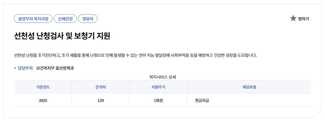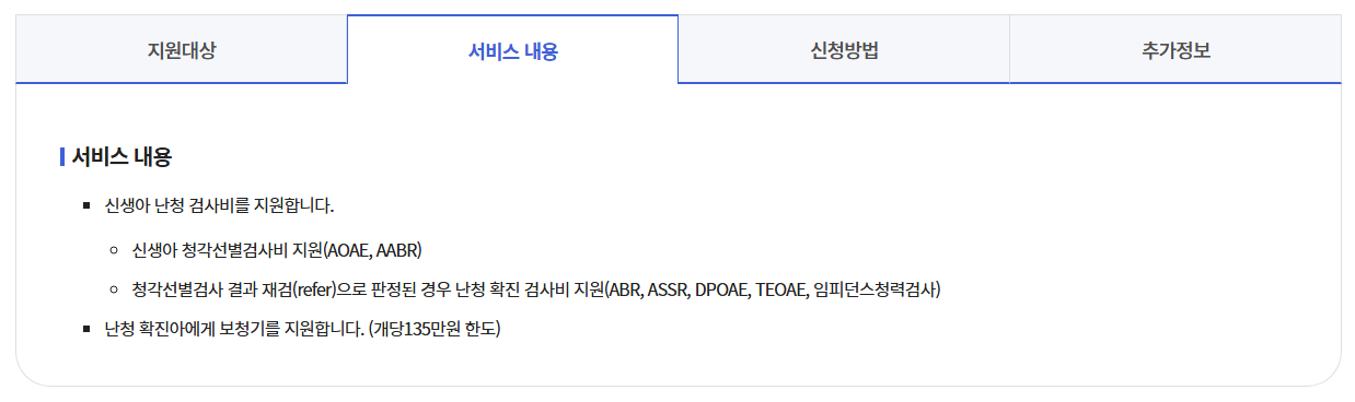 다만 검사비는 출생일로부터 1년 이내, 보청기는 신청일 기준 6개월 전후 구입분만 인정되므로 기간을 꼭 확인하세요.