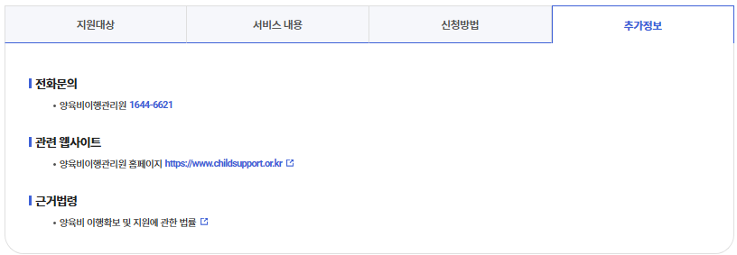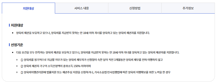 | 추심 지원 | 양육비 채권 추심 지원 | 회수 완료시까지 | 확정된 양육비 채권 보유 |