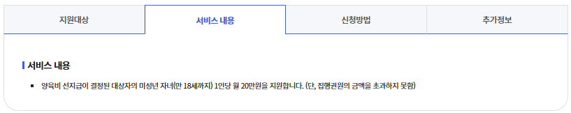 | 기본 혜택 | 자녀 1인당 월 20만원 | 18세까지 | 3개월 이상 미지급 |