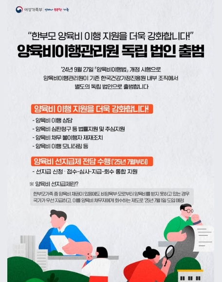 여성가족부가 양육비 이행확보 및 지원에 관한 법률을 개정하여 2025년 7월 1일부터 양육비 선지급제도가 시행되었습니다.