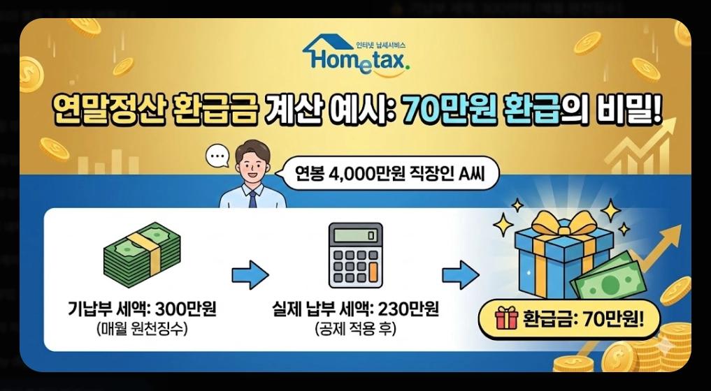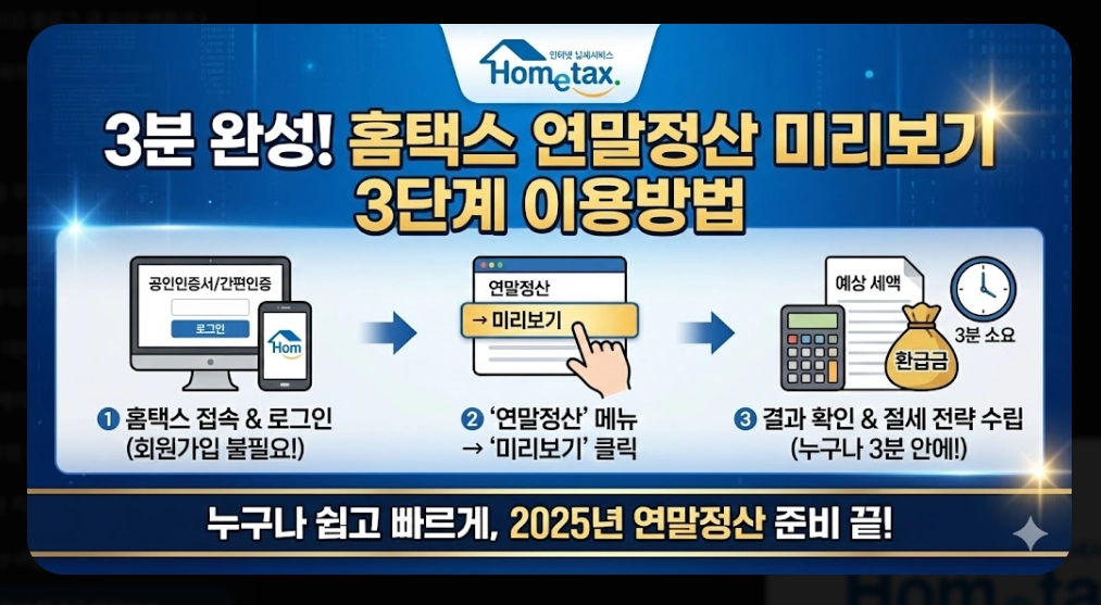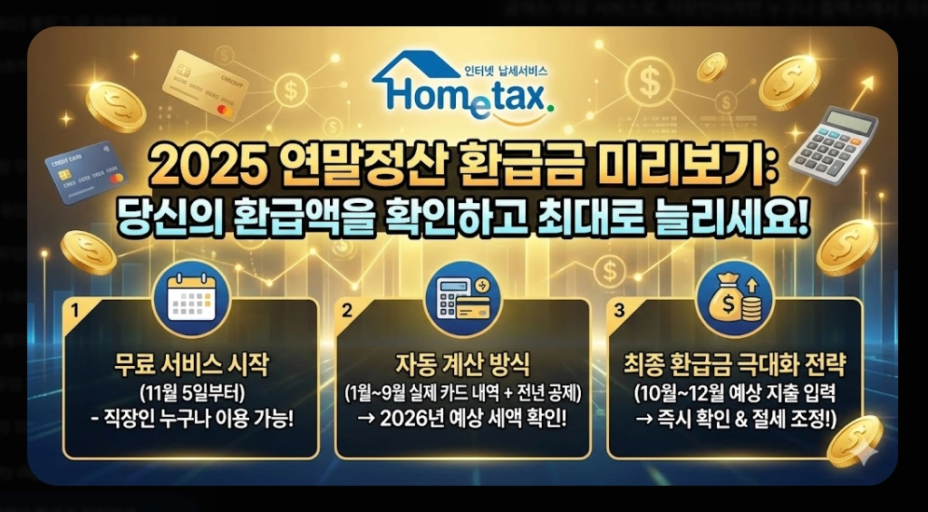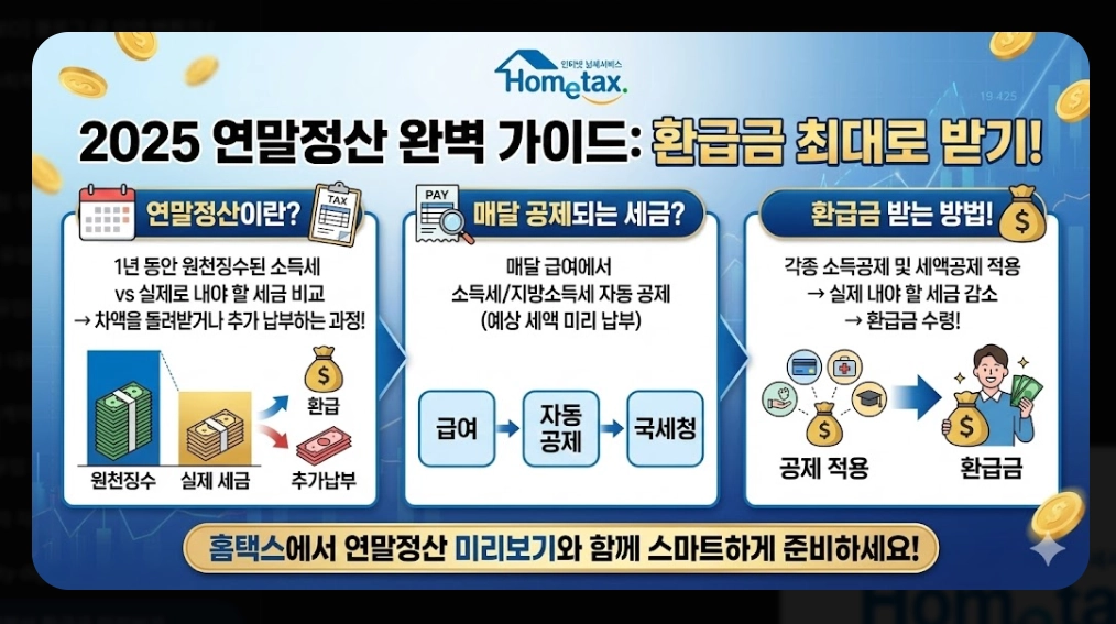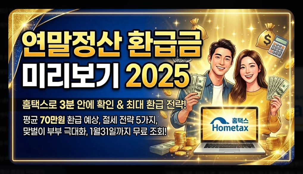"연말정산 환급금 미리보기 2025: 홈택스로 3분 안에 확인하는 방법 및 최대 환급 전략. 평균 70만원 환급 예상, 절세 전략 5가지, 맞벌이 부부 극대화 방법까지 총정리. 1월 31일까지 무료 조회 가능."