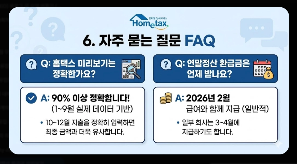 | 홈택스 미리보기는 정확한가요? | 1~9월 실제 데이터를 기반으로 하므로 90% 이상 정확합니다. 다만 10~12월 지출을 정확히 입력해야 최종 금액과 유사합니다. |