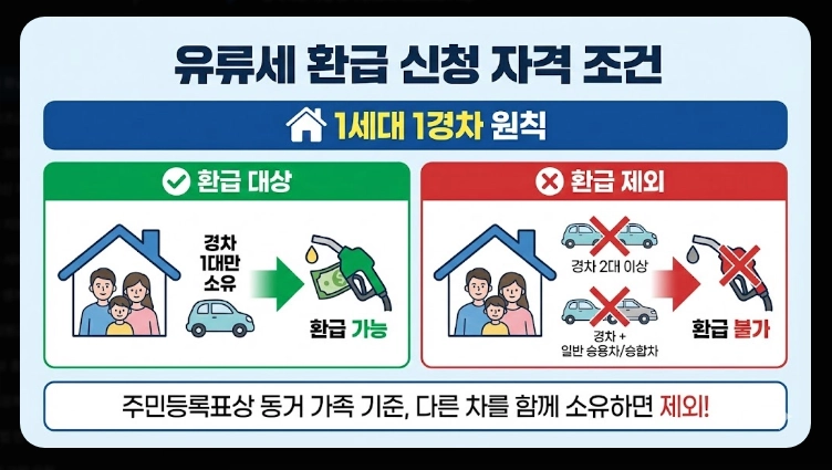 주민등록표상 동거 가족이 소유한 경차 각각의 합계가 1대여야 하며, 일반 승용차나 승합차를 함께 소유하면 환급 대상에서 제외됩니다.