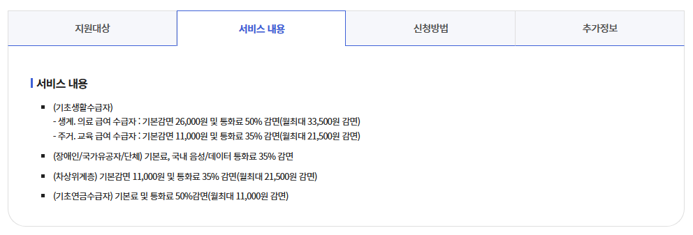 | 기초생활수급자(주거/교육)/차상위 | 기본감면 11,000원 + 통화료 35% 감면 (월 최대 21,500원) | 자격 유지 시 계속 | 중위소득 43~50% 이하 |