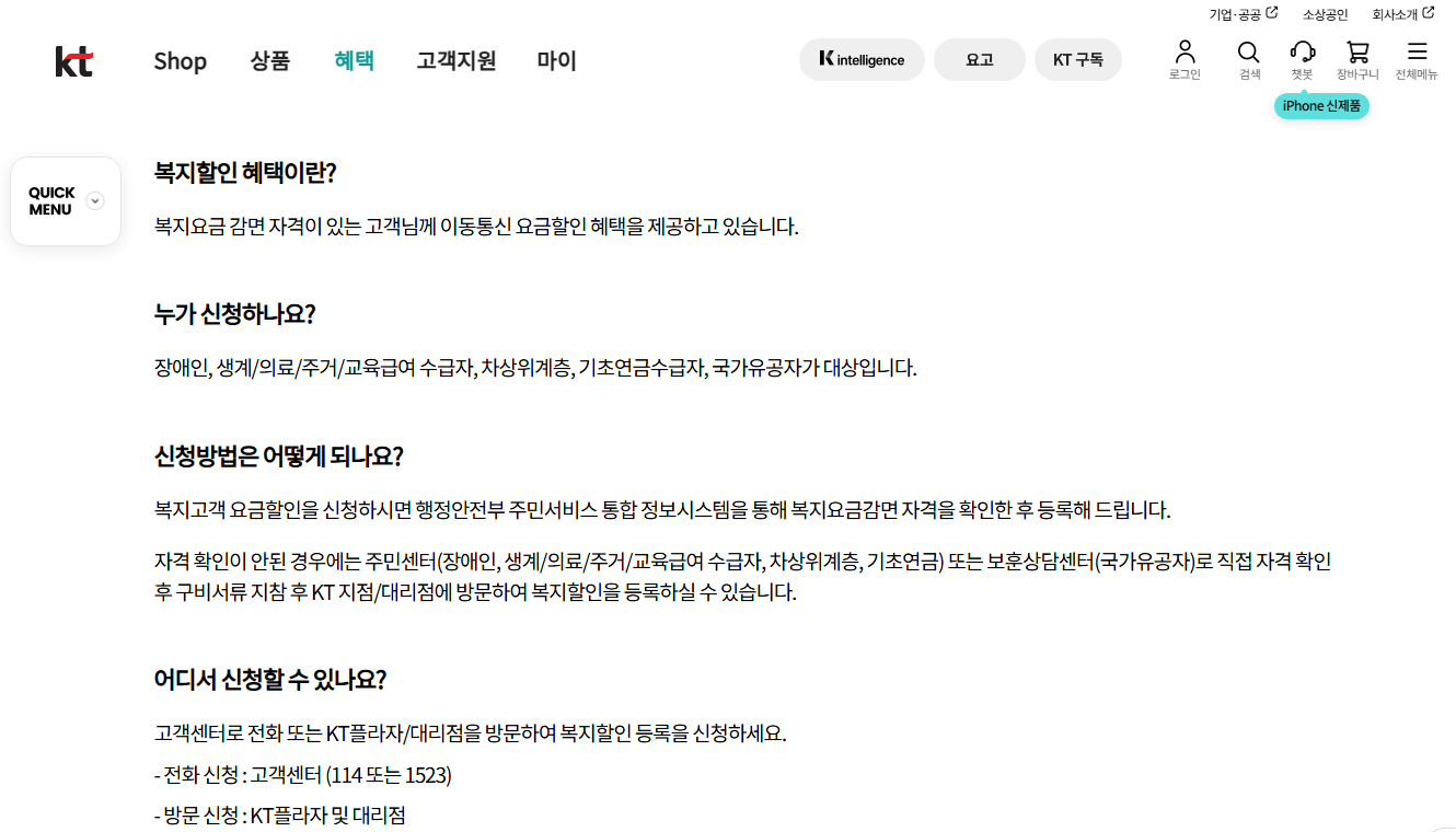 | Q8. 결합상품 할인과 중복 적용되나요? | A8. 네, 중복 적용 가능해요. 기초생활수급자는 복지할인 우선 적용 후 결합할인이 적용되고, 장애인과 기초연금수급자는 결합할인 우선 적용 후 복지할인이 적용됩니다. |
