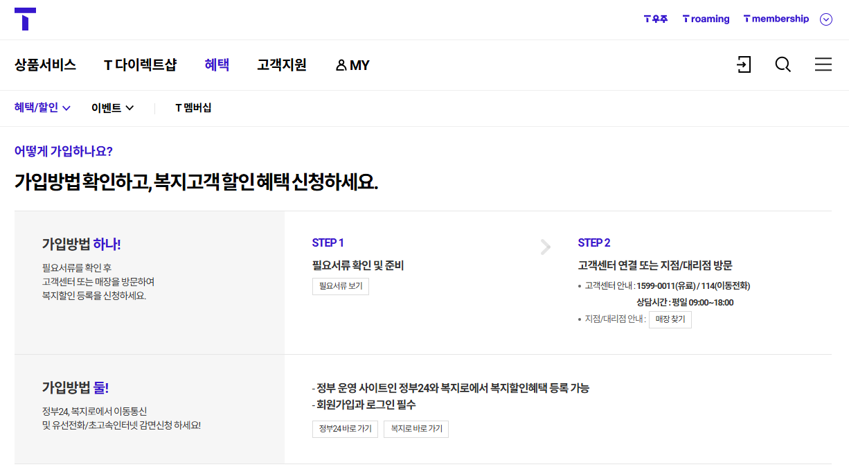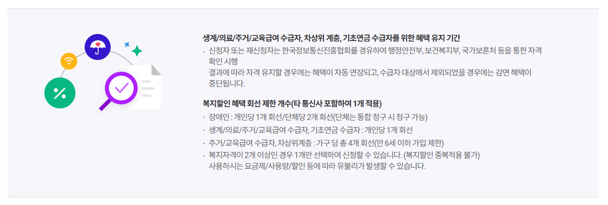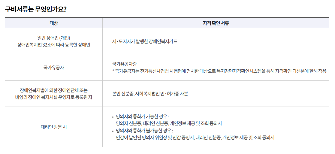 | 누가 받을 수 있나요? | 장애인, 기초생활수급자, 차상위계층, 기초연금수급자, 국가유공자 | 1인 1회선 원칙 |