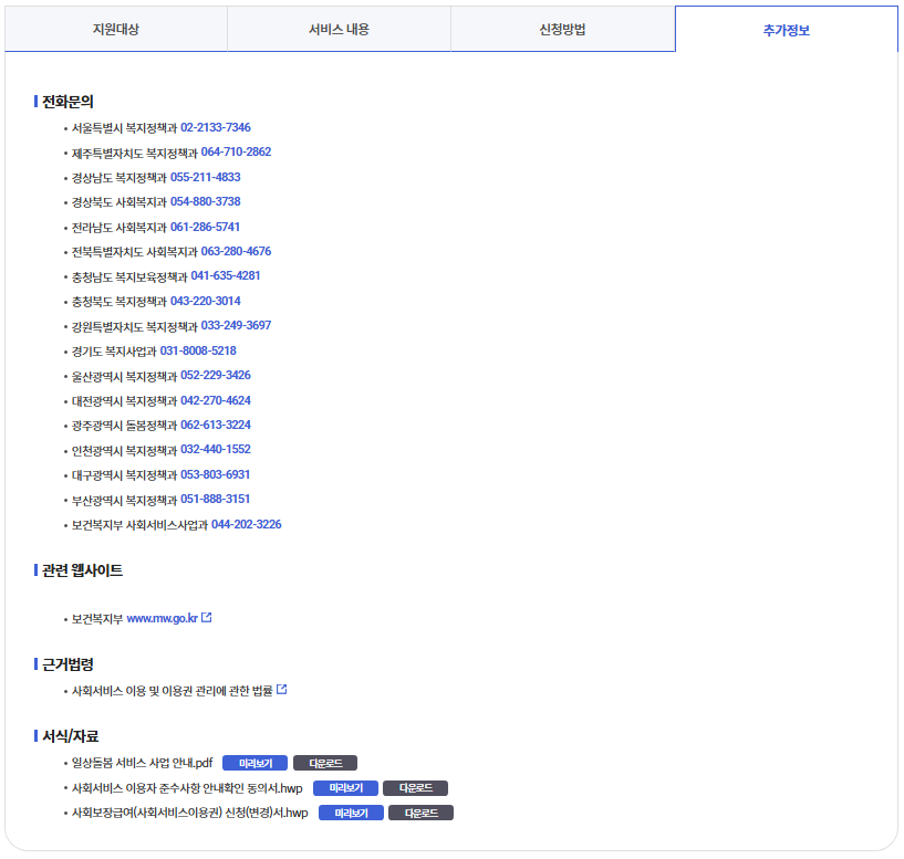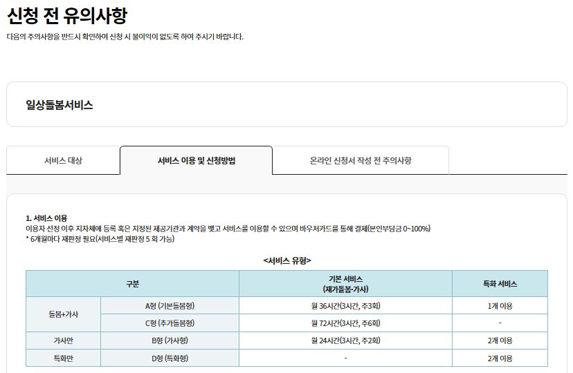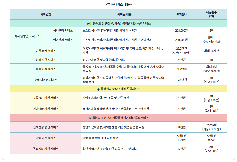 | 어떤 서비스를 받나요? | 재가 돌봄, 가사, 심리지원, 병원 동행 등 | 유형별로 이용시간 다름 |