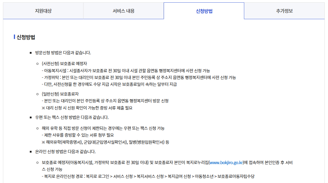 신청 방법: 보호종료 전후 해당 지자체에 신청