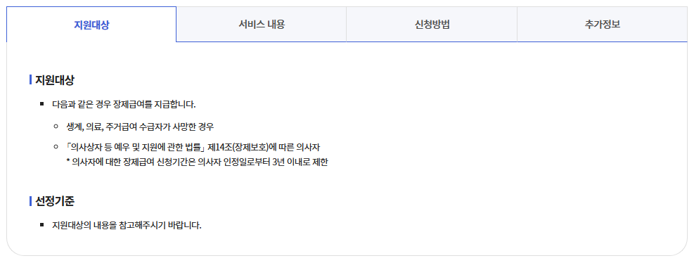 기본 장제급여 1구당 80만원 신청일로부터 4일 이내 지급 실제 장례를 치른 사람