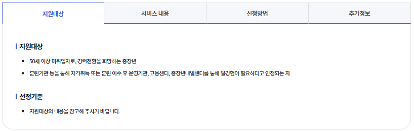 | 지원 대상 | 50대 이상 퇴직 중장년 | 자격증 취득 또는 훈련 이수 필수 |
