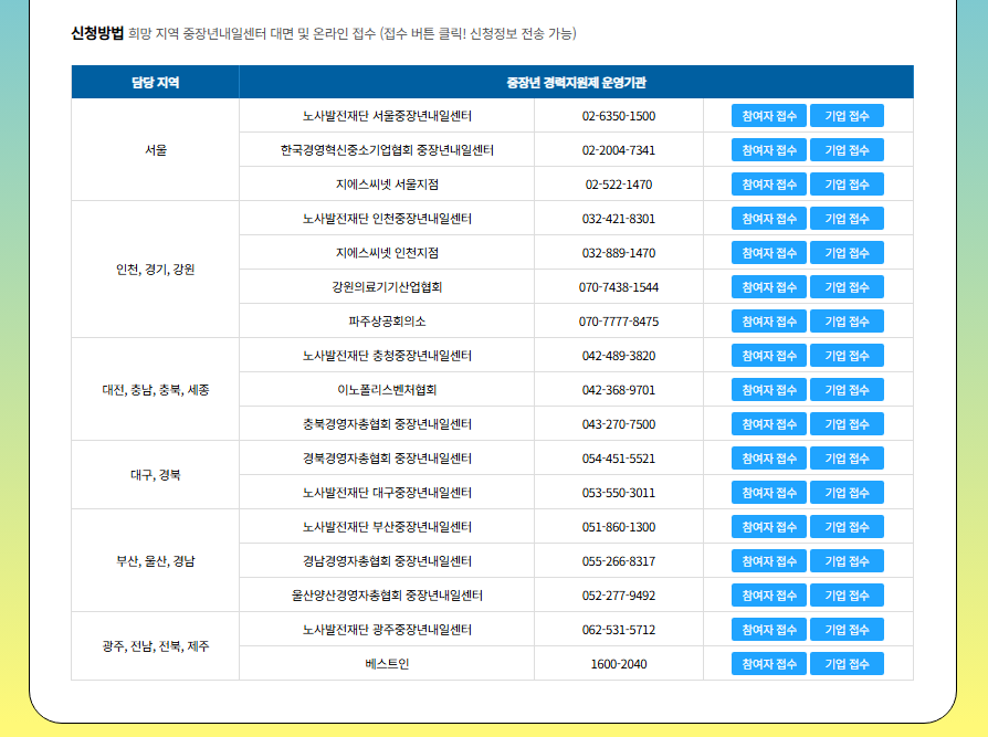 민간위탁기관이 선정되어 전국 중장년 내일센터를 통해 신청을 받고 있습니다.