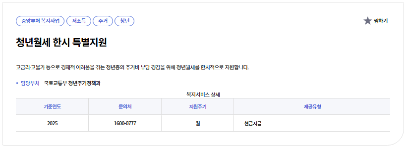 | 기본 월세 지원 | 월 20만원 | 최대 24개월 | 만 19~34세 무주택 청년 |