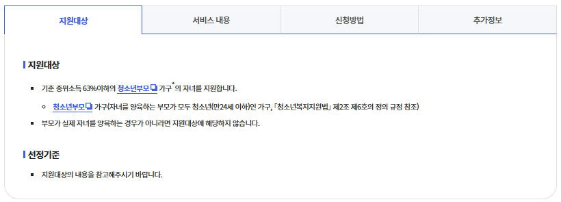 | 기본 아동양육비 | 자녀 1명당 월 25만원 | 신청월부터 계속 지급 | 부모 모두 24세 이하, 중위소득 63% 이하 |