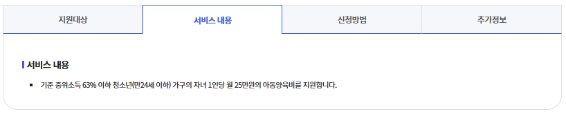 | 얼마를 받나요? | 자녀 1명당 월 25만원 | 신청월부터 지급 시작 |