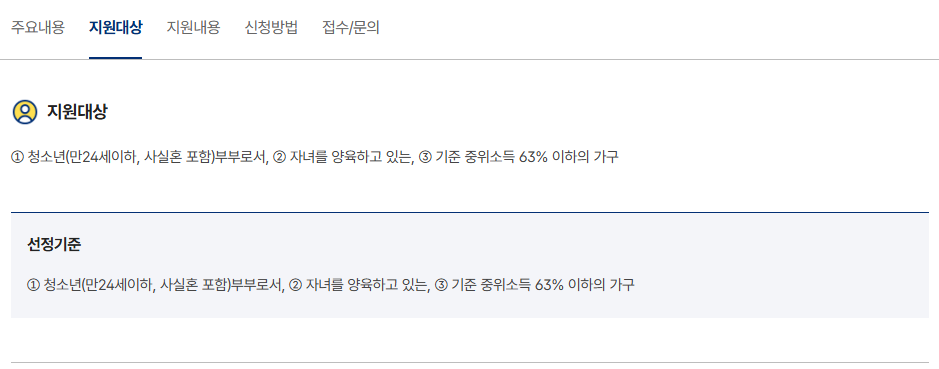 또한 실제로 자녀를 양육하고 있어야 하며, 기준 중위소득 63% 이하에 해당해야 합니다.