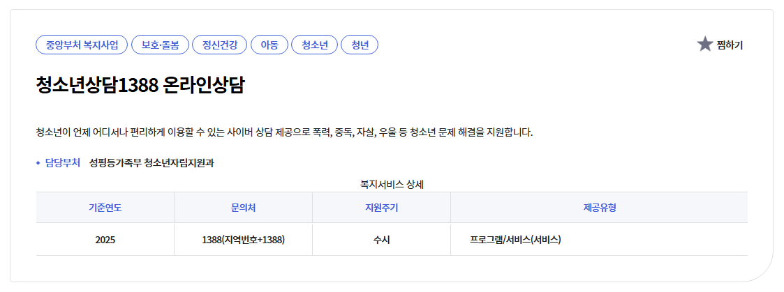 2025.10.14 - [복지정책] - 청소년상담1388, 9~24세 누구나 365일 24시간 무료 이용방법