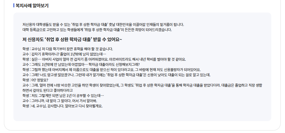 | 30대/대전 | "대학원 진학을 고민했는데 취업후상환 대출 덕분에 부담없이 석사과정을 마칠 수 있었습니다. 연구에만 집중할 수 있어서 좋은 성과를 냈어요." | 대학원생도 4구간 이하면 신청 가능 |