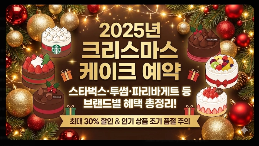 크리스마스 케이크 예약 2025 스타벅스·투썸·파리바게트 최대 30% 할인받는 법을 총정리했습니다. 브랜드별 예약 마감일, 인기 케이크 라인업, 할인 혜택까지 한눈에 확인하세요.