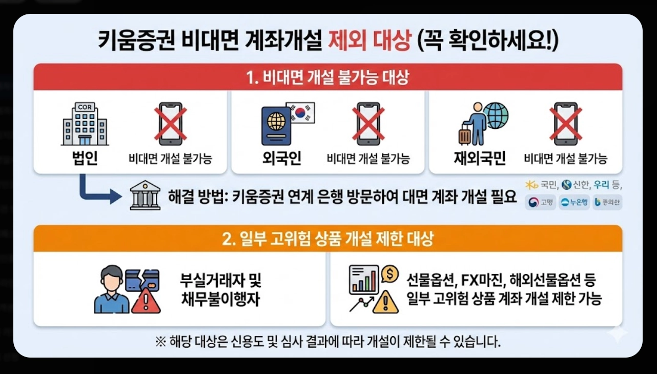 | 외국인도 비대면 개설이 가능한가요? | 외국인과 재외국민은 비대면 개설이 불가능하며, 키움증권 연계 은행을 방문하여 개설해야 합니다. |