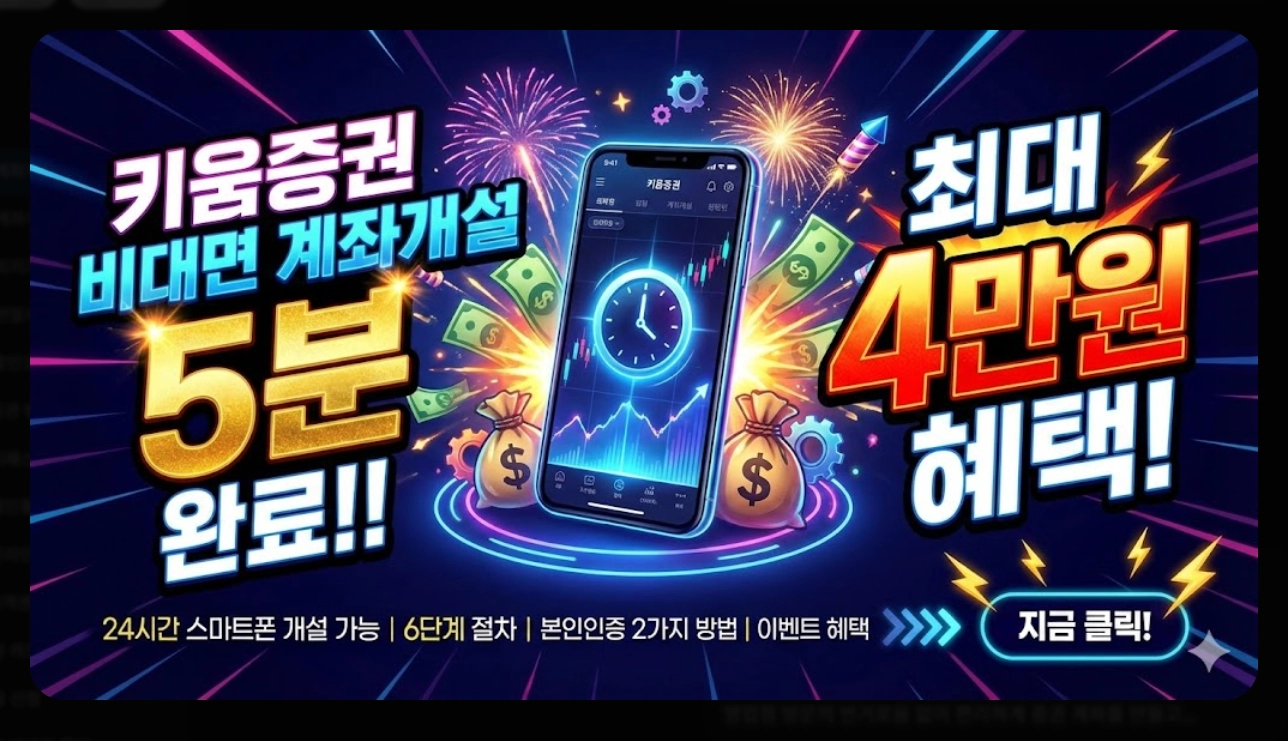 키움증권 계좌개설 비대면으로 5분만에 완료하고 최대 4만원 받는 방법을 소개합니다. 24시간 스마트폰 개설 가능, 6단계 절차, 본인인증 2가지 방법, 이벤트 혜택까지 완벽 정리했습니다.