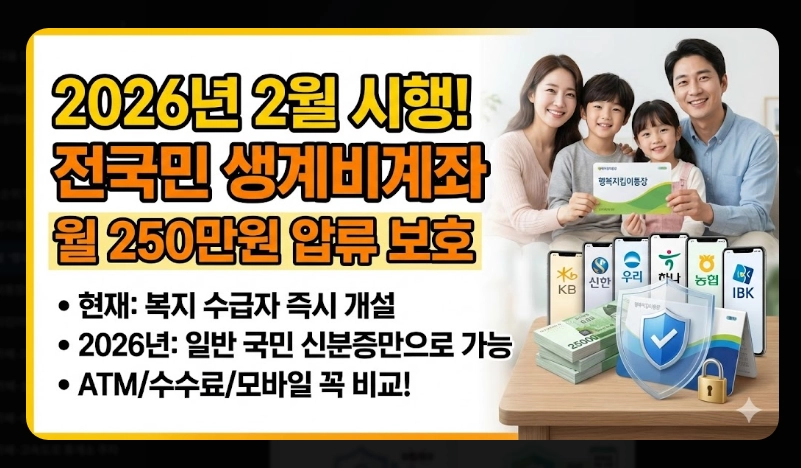 📌 2026년 2월 1일부터 전 국민 생계비통장(생계비계좌) 개설 가능! 월 250만원까지 압류 걱정 없이 보호받으세요. 신분증만 있으면 은행 방문 즉시 개설 가능하며, 1인 1계좌 원칙입니다. 지금 바