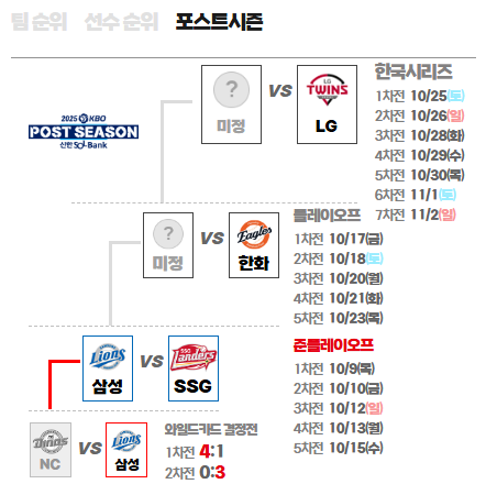 대진 팀 SSG vs 와일드카드 승자 삼성 또는 NC 중 1팀