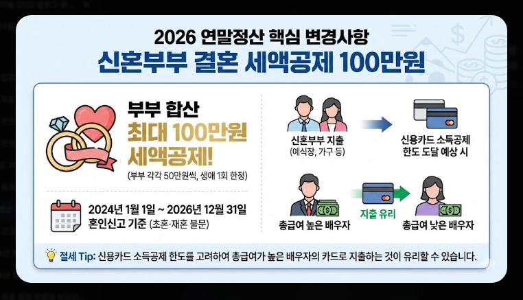 2024년 1월 1일부터 2026년 12월 31일 사이에 혼인신고를 한 부부라면 생애 1회에 한해 부부 각각 50만원씩, 총 100만원의 세액공제를 받을 수 있습니다. 초혼이든 재혼이든 상관없이 적용됩니다.