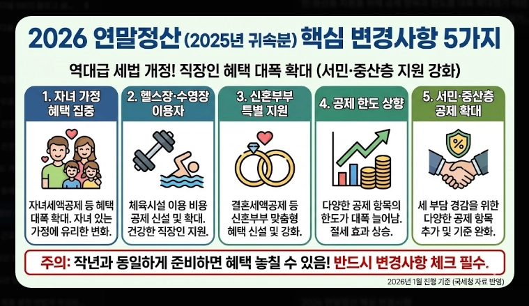 2026년 1월에 진행되는 연말정산(2025년 귀속분)은 역대급 세법 개정으로 직장인들에게 유리한 변화가 많습니다. 정부가 서민·중산층 지원을 위해 공제 항목과 한도를 대폭 확대했기 때문인데요. 직접 국세청 자료를 확인해보니 총 5가지 핵심 변화가 눈에 띕니다.