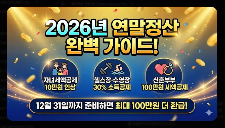 2026년 연말정산은 자녀세액공제 인상, 헬스장·수영장 소득공제 신설, 신혼부부 결혼세액공제 등 직장인들에게 유리한 변화가 많은 해입니다. 이런 혜택들을 제대로 챙기려면 지금부터 12월 31일까지가 골든타임입니다.