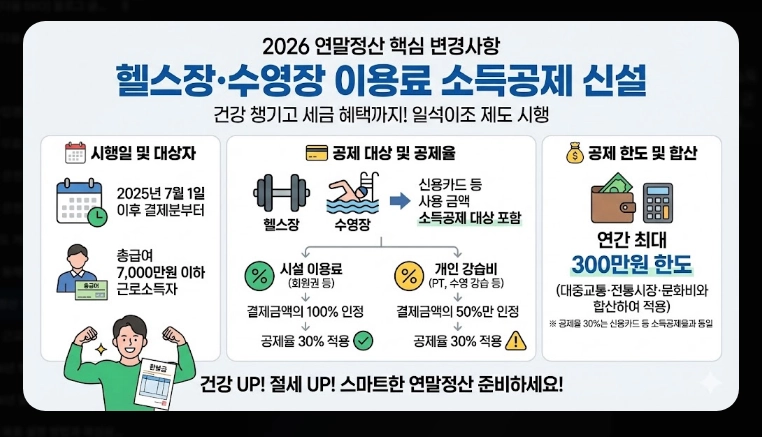 2025년 7월 1일부터 헬스장과 수영장 이용료가 신용카드 소득공제 대상에 새로 포함되었습니다. 총급여 7,000만원 이하 근로소득자가 카드로 결제한 시설 이용료에 대해 30% 공제율이 적용됩니다.